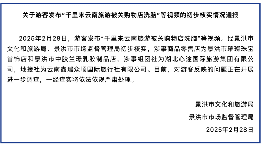 2月28日晚,景洪市文化和旅游局、景洪市市场监督管理局发布情况通报称,经两局初步核实,涉事商品零售店为景洪市璀璨珠宝首饰店和景洪市中胶兰璟乳胶制品店,涉事组团社为湖北心途国际旅游集团有限公司,地接社为云南鑫瑞众顺国际旅行社有限公司。目前,对游客反映的问题正在开展进一步调查,一经查实将依法依规严肃处理。
